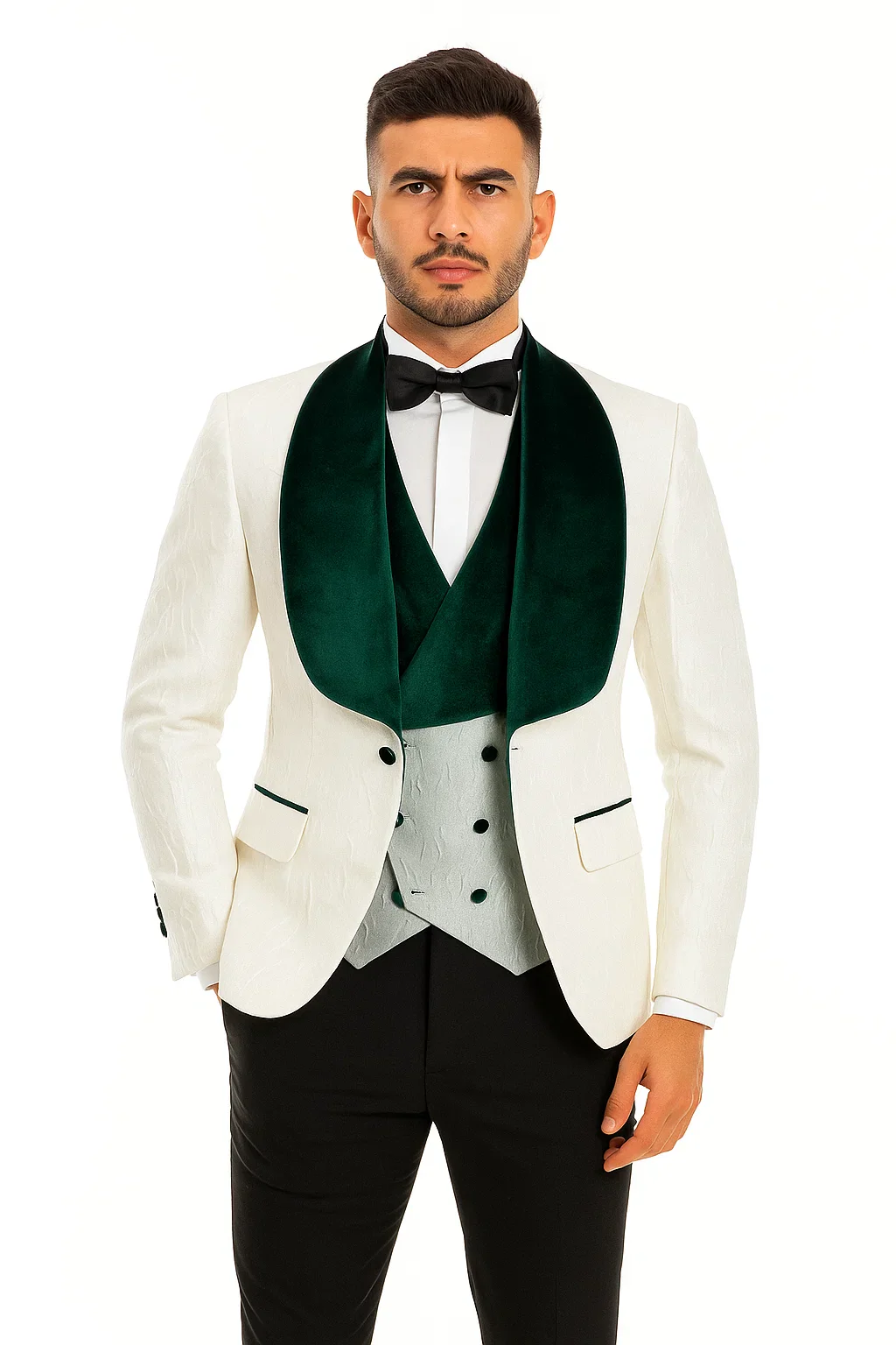 Men’s Ivory & Hunter Green Vested Velvet Tuxedo – Designer Wedding Tuxedo